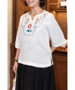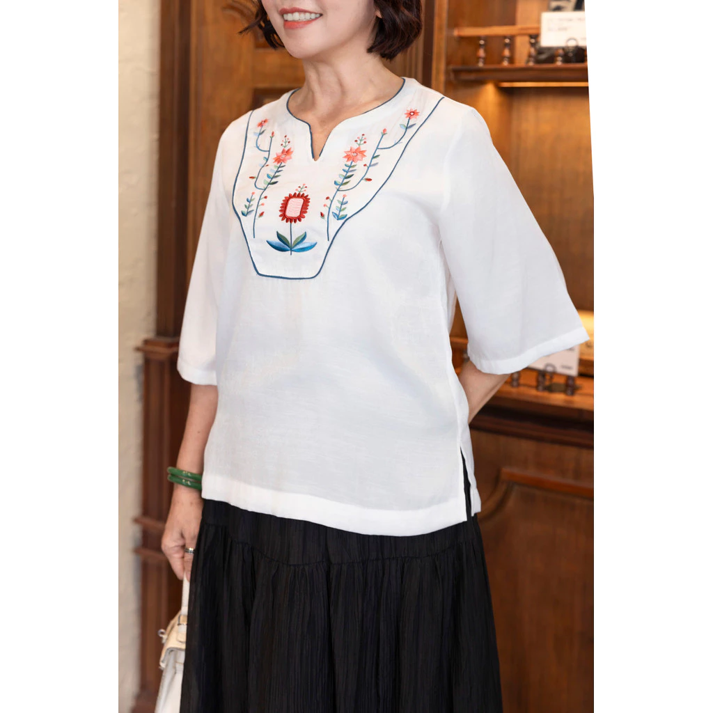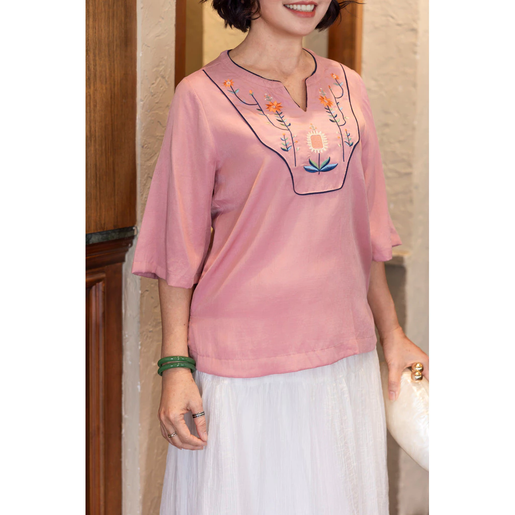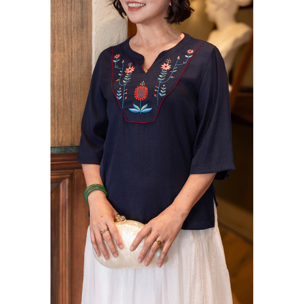 Áo kiểu trung niên vải lụa gân thêu hoa M Collection